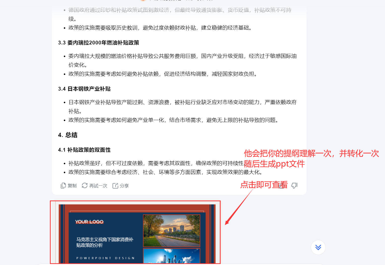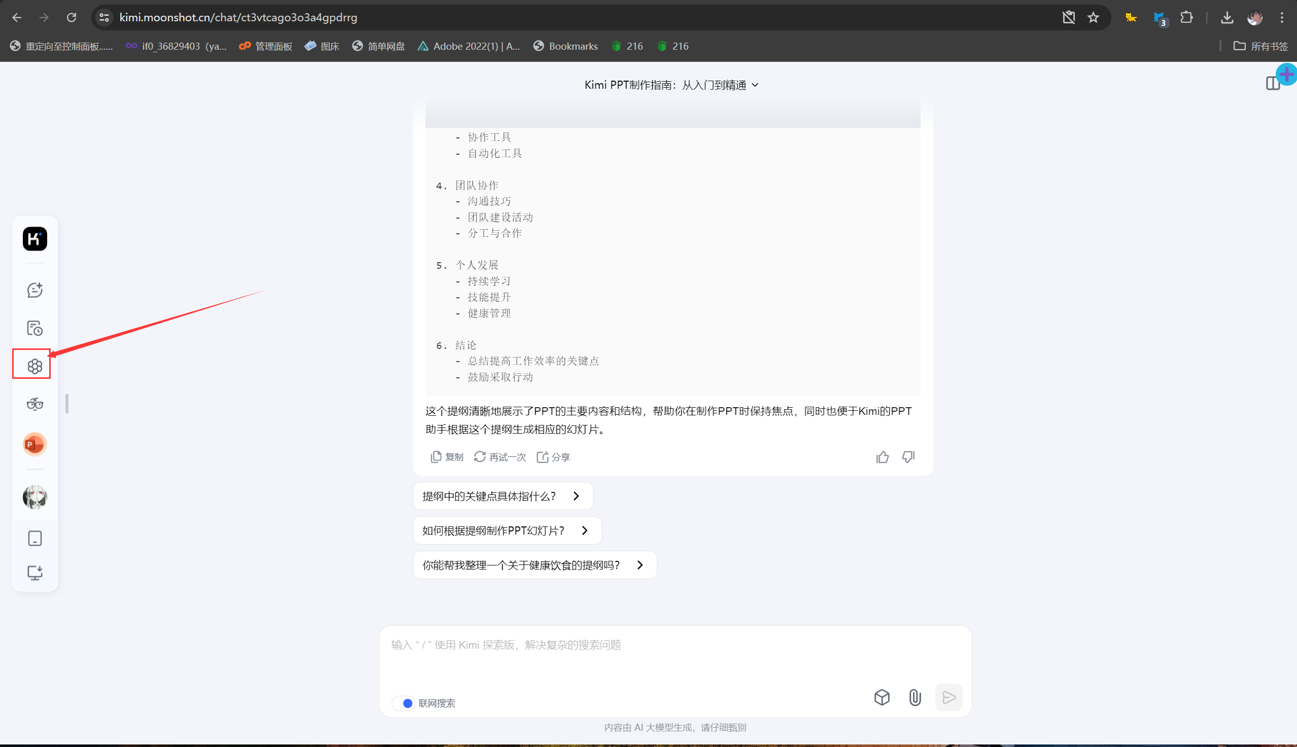 输入你想要的PPT内容后,Kimi会自动帮你构思整理好PPT大纲,并生成预览。