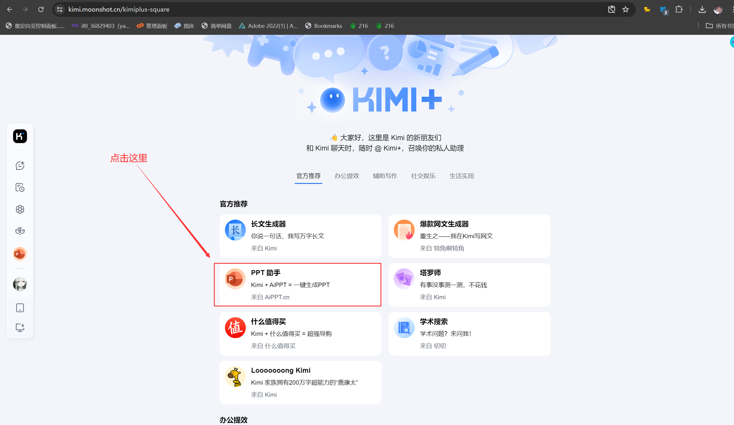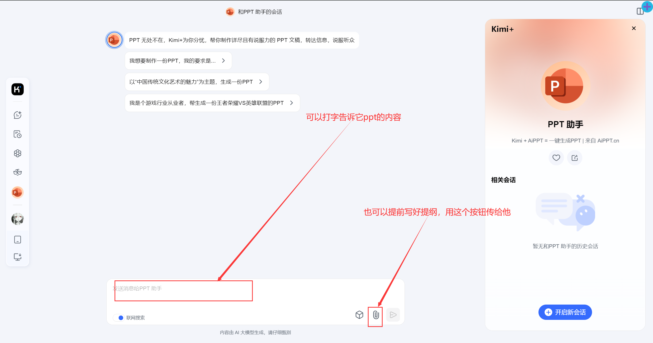 接下来,你可以通过在Kimi的对话框中@PPT助手来唤起PPT助手,或者在Kimi+中找到PPT助手。