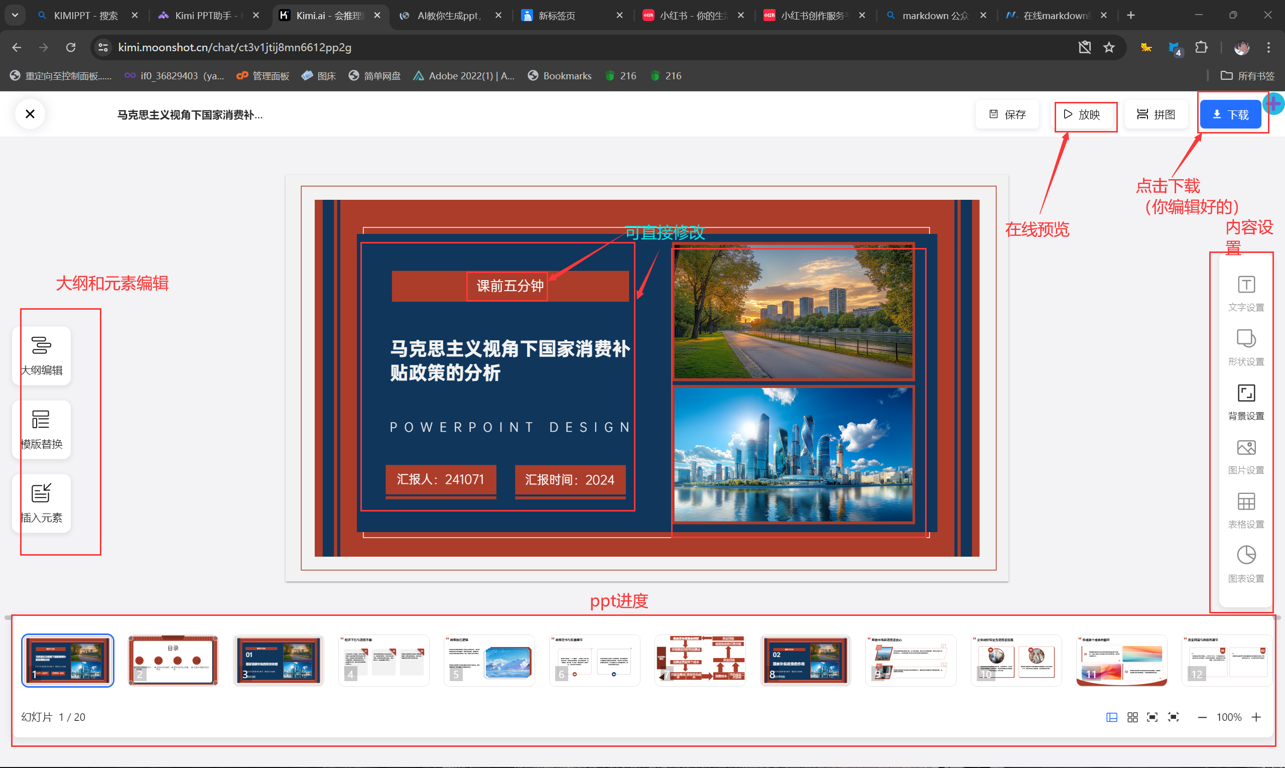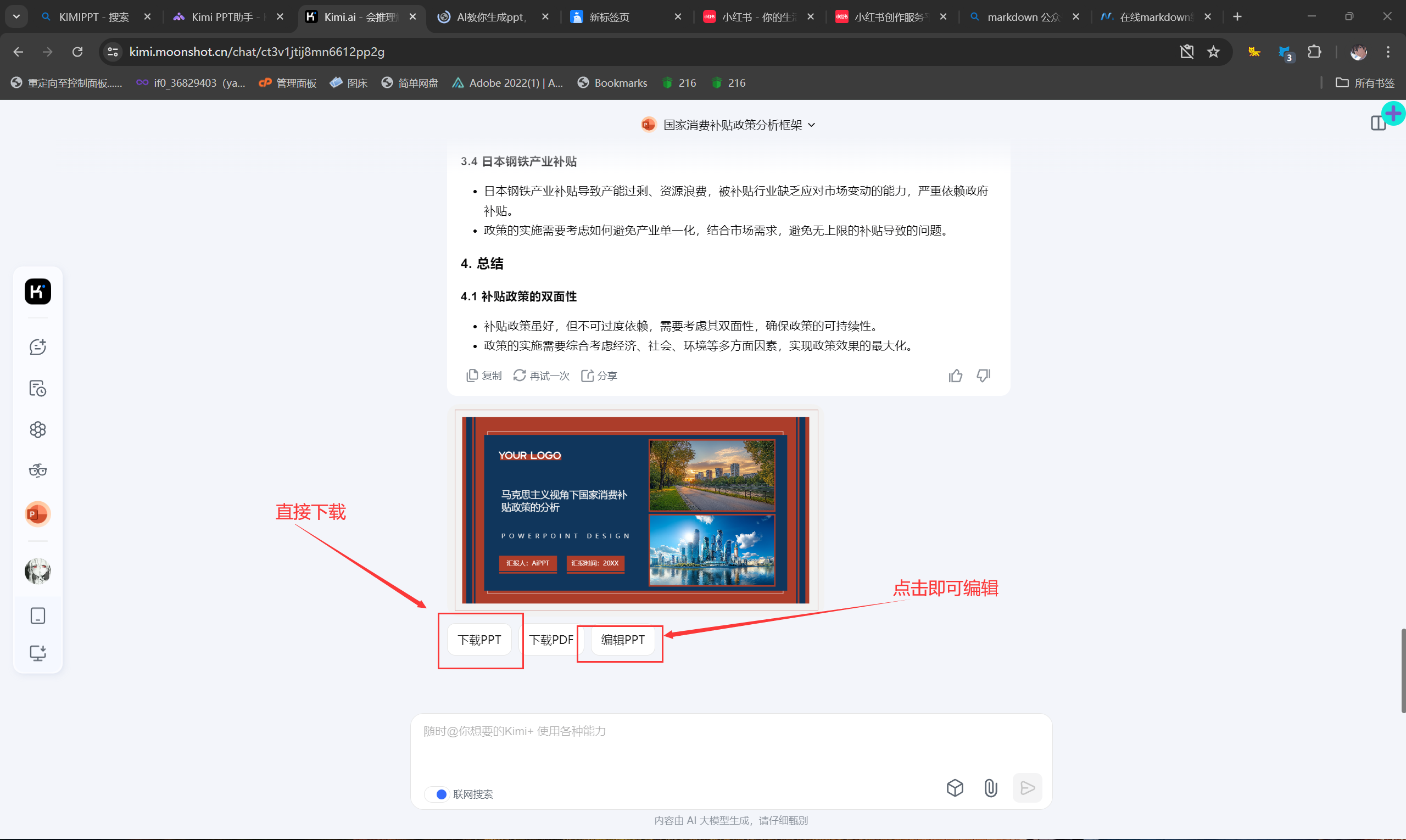 生成预览后,你可以在Kimi网页的PPT助手中对PPT进行修改,优化演示内容。