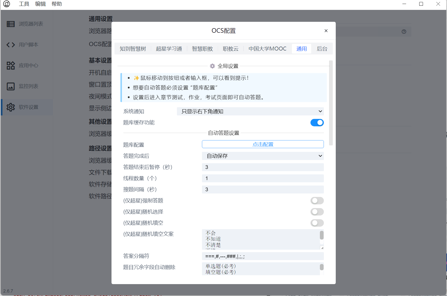 相信大家都会遇到各类平台的网课,如学习通,智慧树,职教云等, 让人非常烦躁这些本就时间紧张还要浪费宝贵流量去刷课,在今天就介绍大家一款好用的工具:OCS网课助手